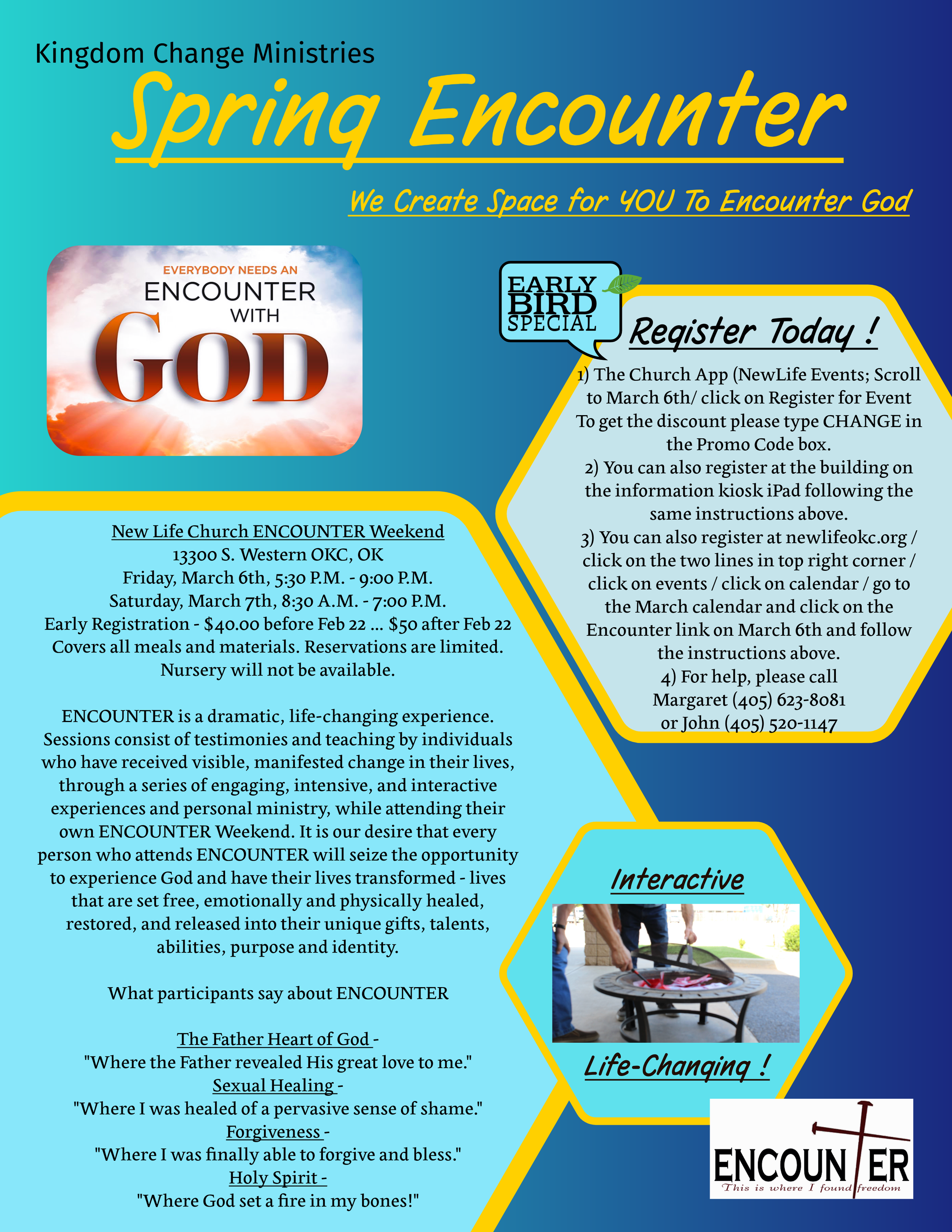 It is our desire that every person who attends Encounter will seize the opportunity to experience God. The results will be manifested in transformed lives - lives that are set free, emotionally and physically healed, restored, and released into their unique gifts, talents, abilities, purpose and identity.